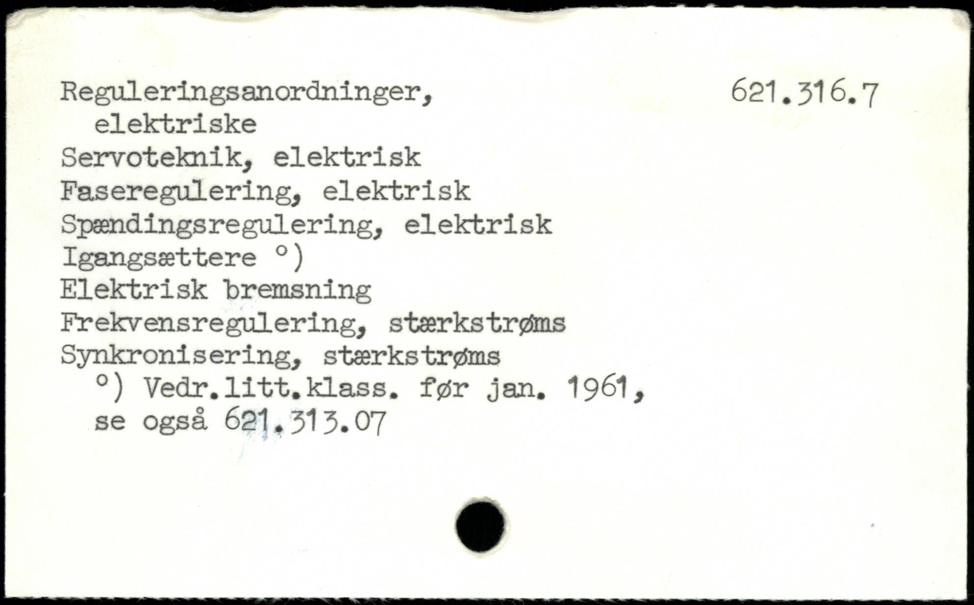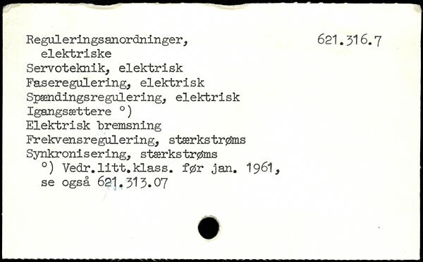 ^ il , ■ ■ Reguleringsanordninger, 621.316.7 elektriske Servoteknik, elektrisk Faseregulering, elektrisk Spændingsregulering, elektrisk Igangsættere .) Elektrisk tremsning Frekvensregulering, stærkstrøms Synkronisering, stærkstrøms .) Vedr.litt.klass. før jan. 1961, se også 621,313.07