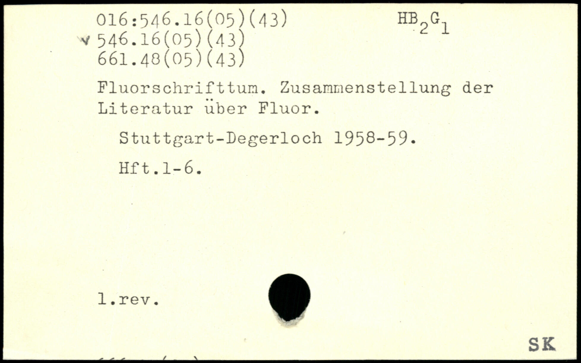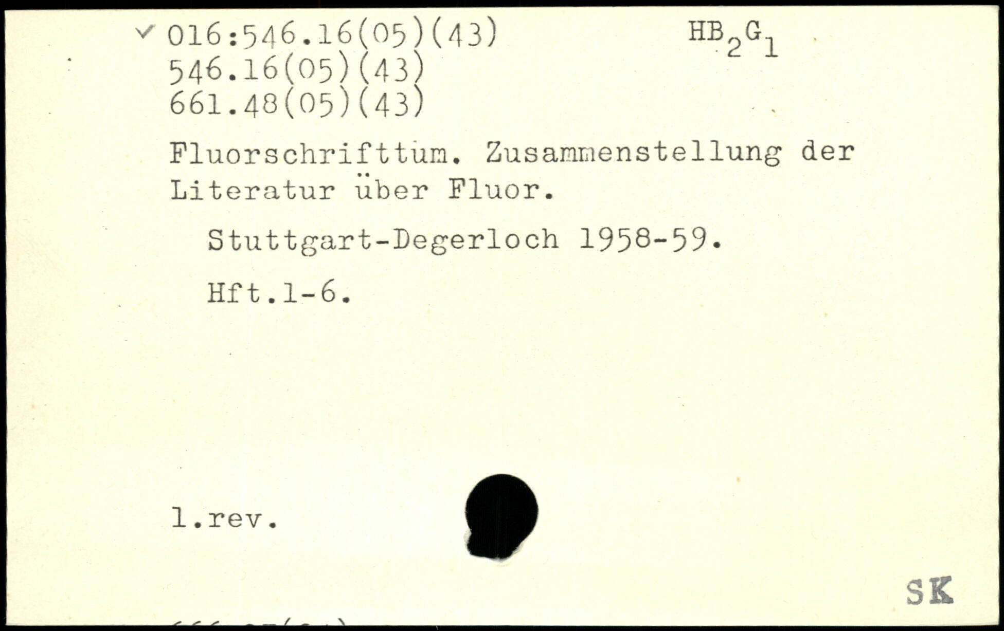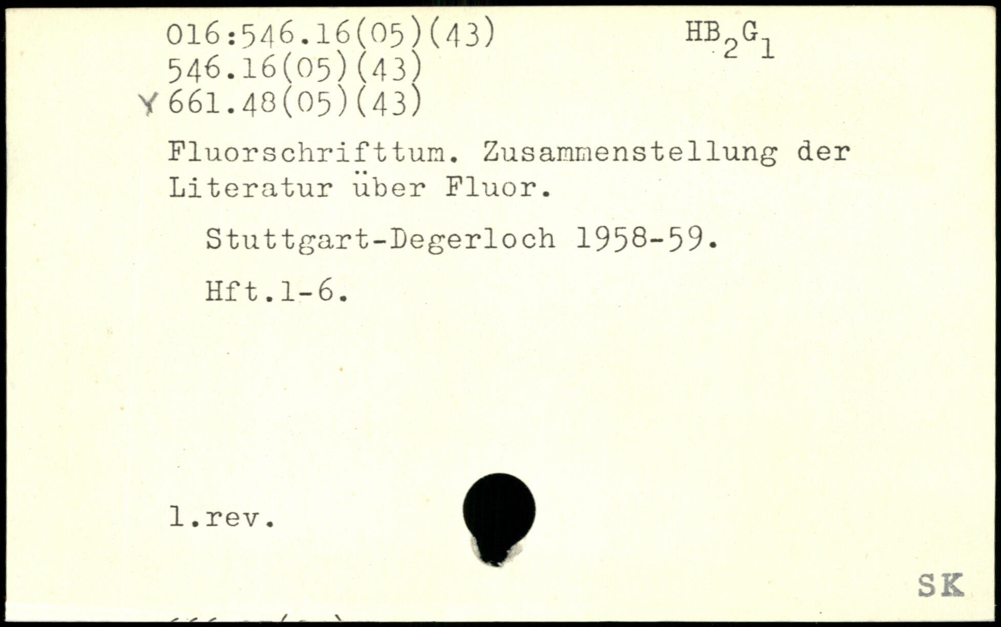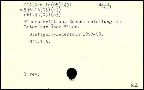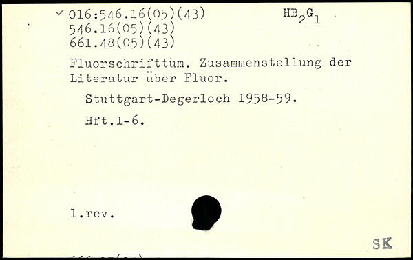 Fluorschrifttum. Zusammenstellung der Literatur über Fluor. Stuttgart-Degerloch 1958-59. Hft.1-6.