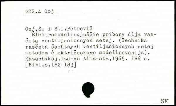 Elektromodelirujuscie pribory dija ras-ceta ventiljacionnych setej. (Technika rasceta sachtnych ventiljacionnych setej metodom élektriceskogo modelirovanija). Kazachs"ko j , Izd-vo Alma-ata,1965.