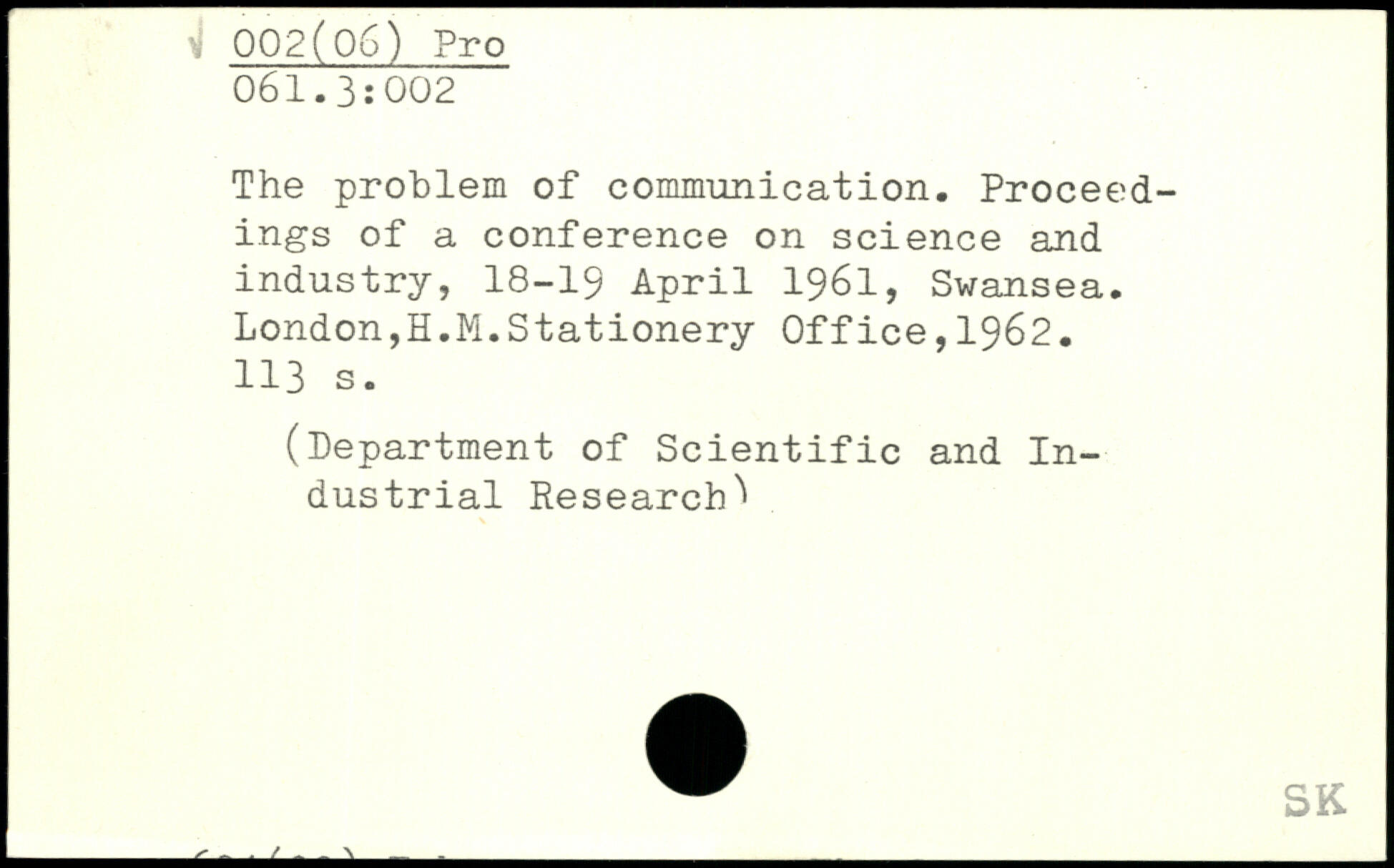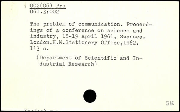 The problem of communication. Proceedings of a conference on science and industry, 18-19 April 1961, Swansea. London,H.M.Stationery Office,1962.