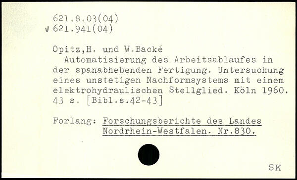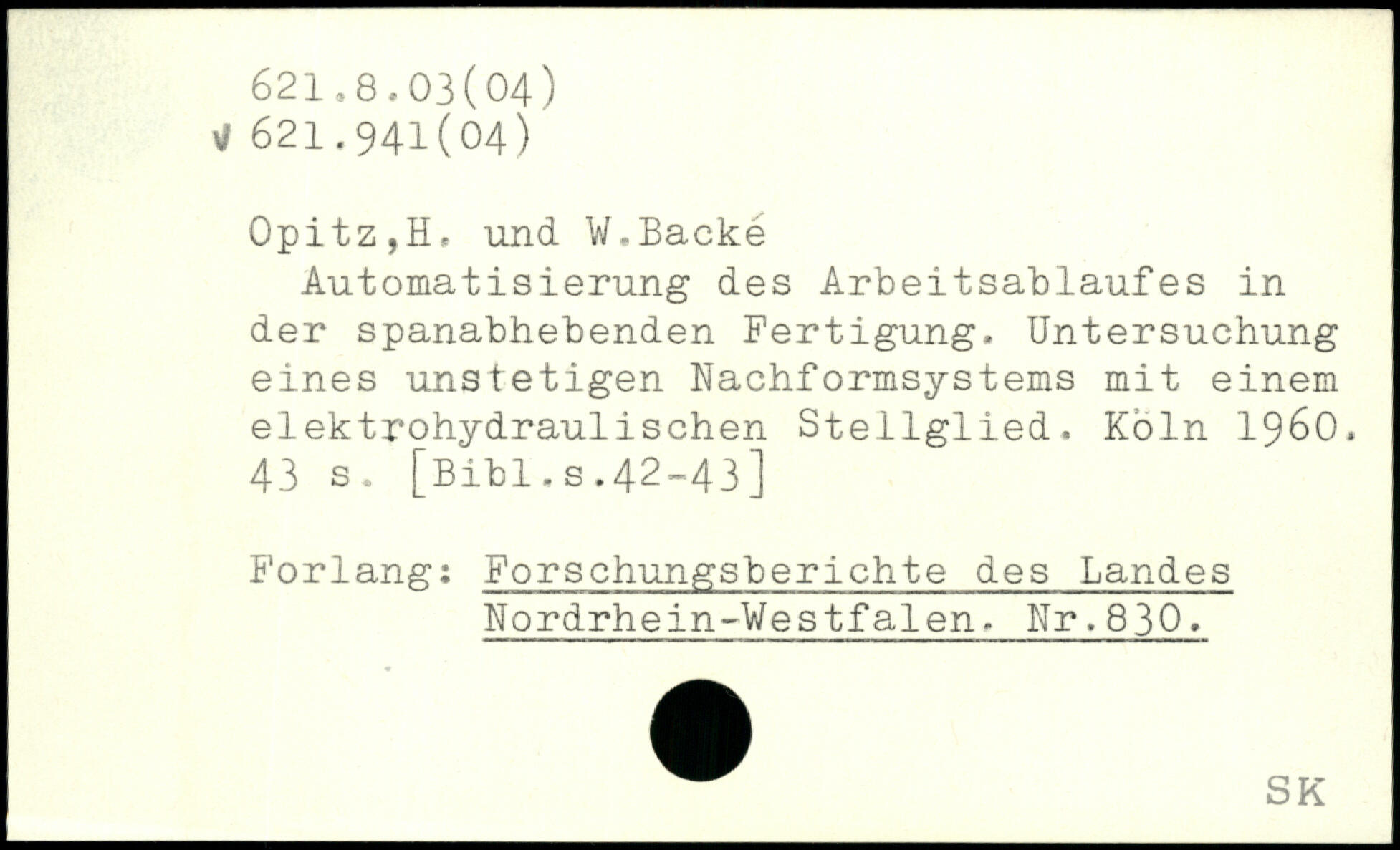 Opitz,H, und W.Backe Automatisierung des Arbeitsablaufes in der spanabhebenden Fertigung. Untersuchung eines unstetigen Nachformsystems mit einem elektrohydraulischen Stellglied.