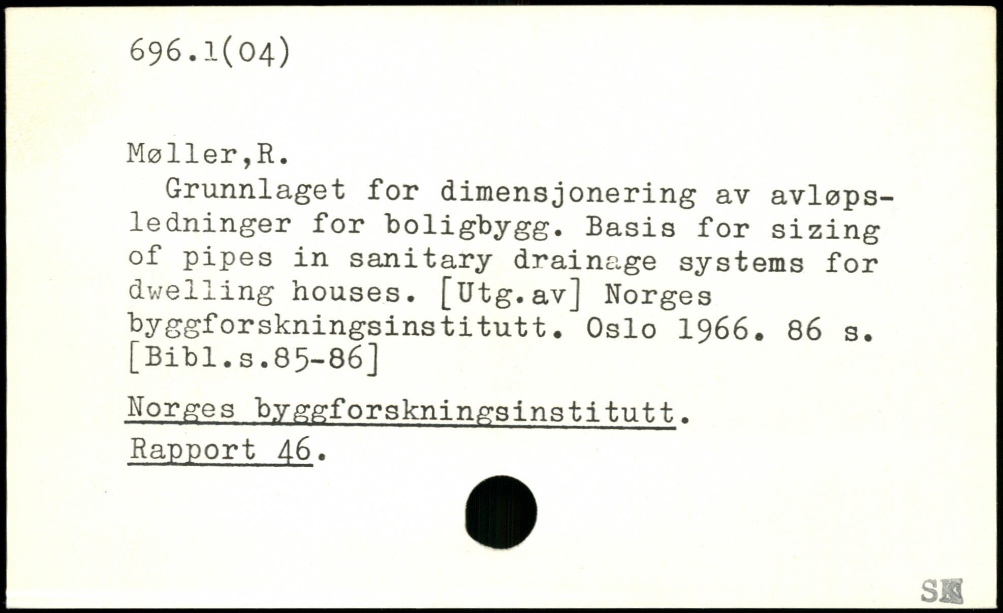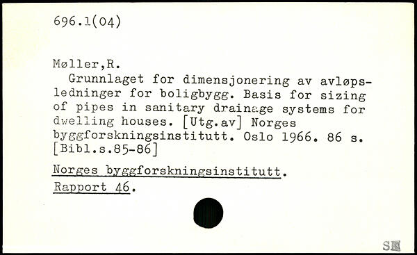 Grunnlaget for dimensjonering av avløps-ledninger for boligbygg. Basis for sizing of pipes in sanitary drainage systems for dwelling houses.