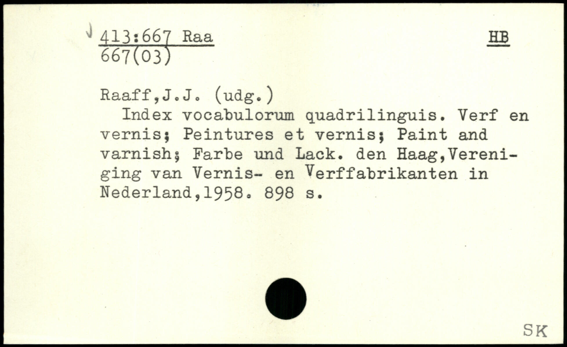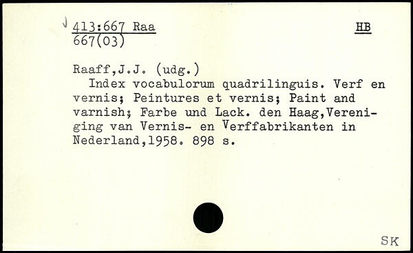 Index vocatulorum quadrilinguis. Verf en vernis; Peintures et vernis; Paint and varnish; Parte und Lack. den Haag,Vereni-ging van Yernis- en Verffabrikanten in Nederland,1958.