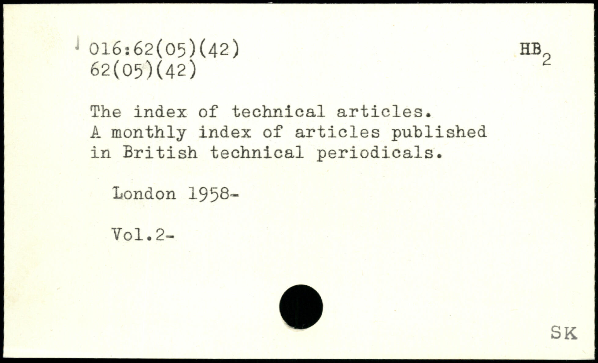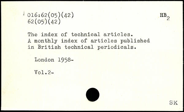 The index of technical articles. A monthly index of articles published in British technical periodicals.