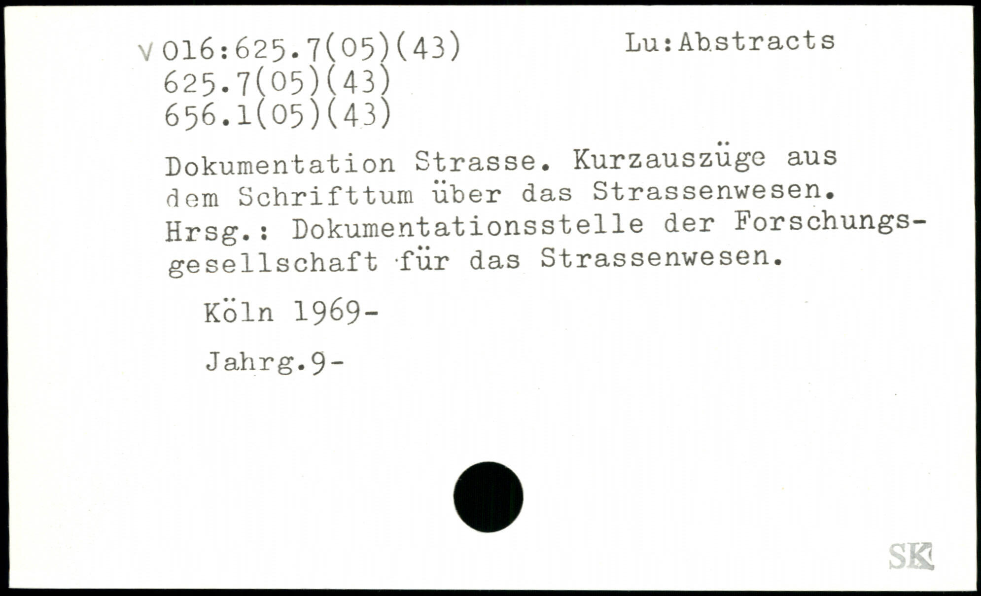 Dokumentation Strasse. Kurzauszüge aus dem Schrifttum über das Strassenwesen. Hrsg.: Dokumentationsstelle der Forschungsgesellschaft -für das Strassenwesen.