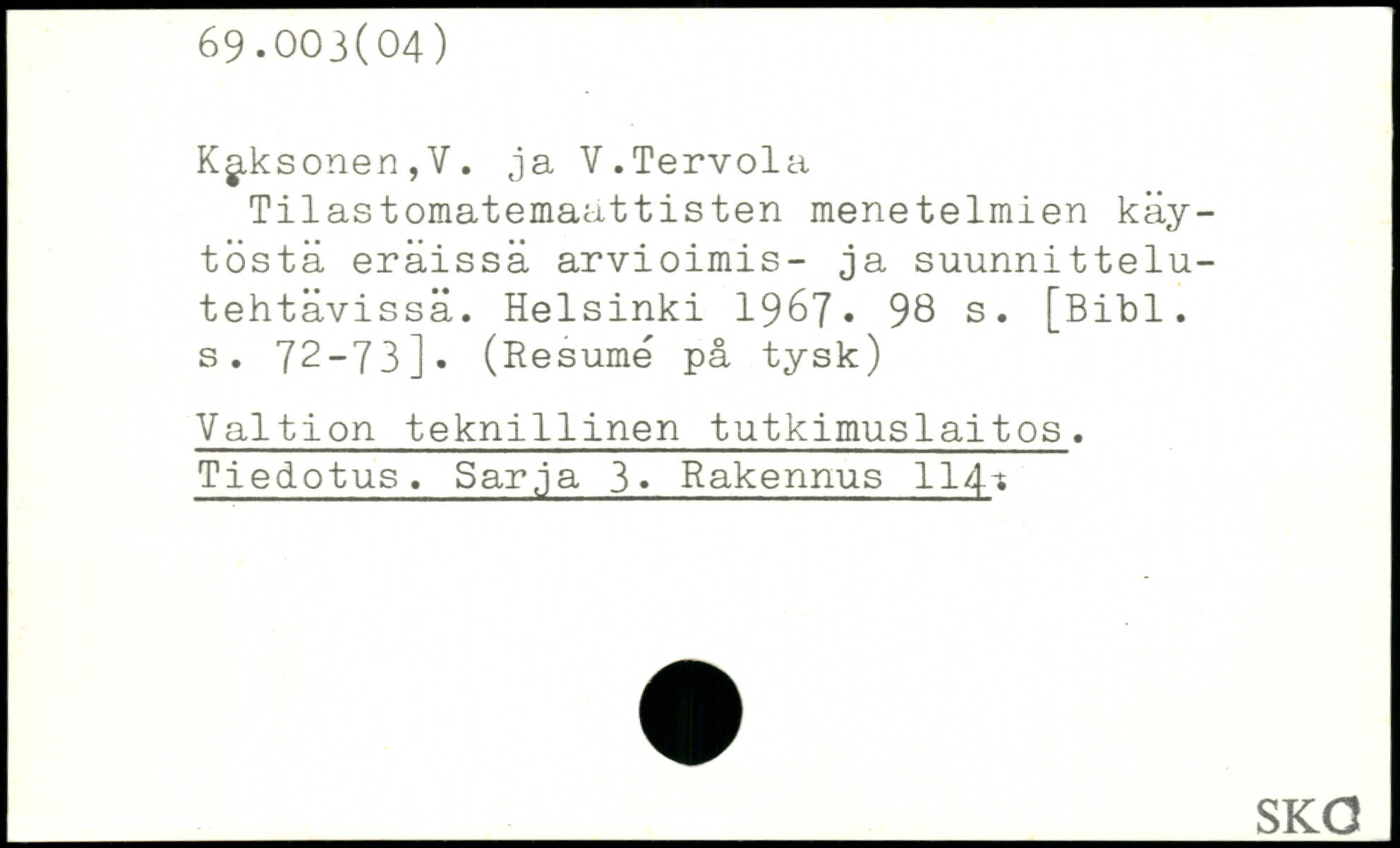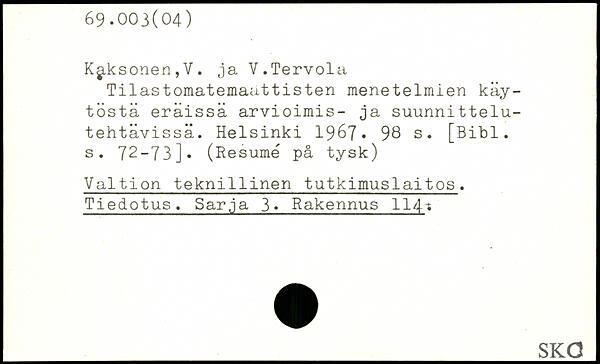 K^.ksonen,Y. ja V.Tervola Tilastomatemaattisten menetelmien käy-töstä eräissä arvioimis- ja suunnittelu-tehtävissä.