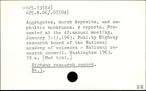 Aggregates, marsh deposits, and asphaltic membranes. 4 reports. Presented at the 42.annual meeting, January 7-H,1963, Pub 1.by Highway research board of the National academy of sciences - National research council.