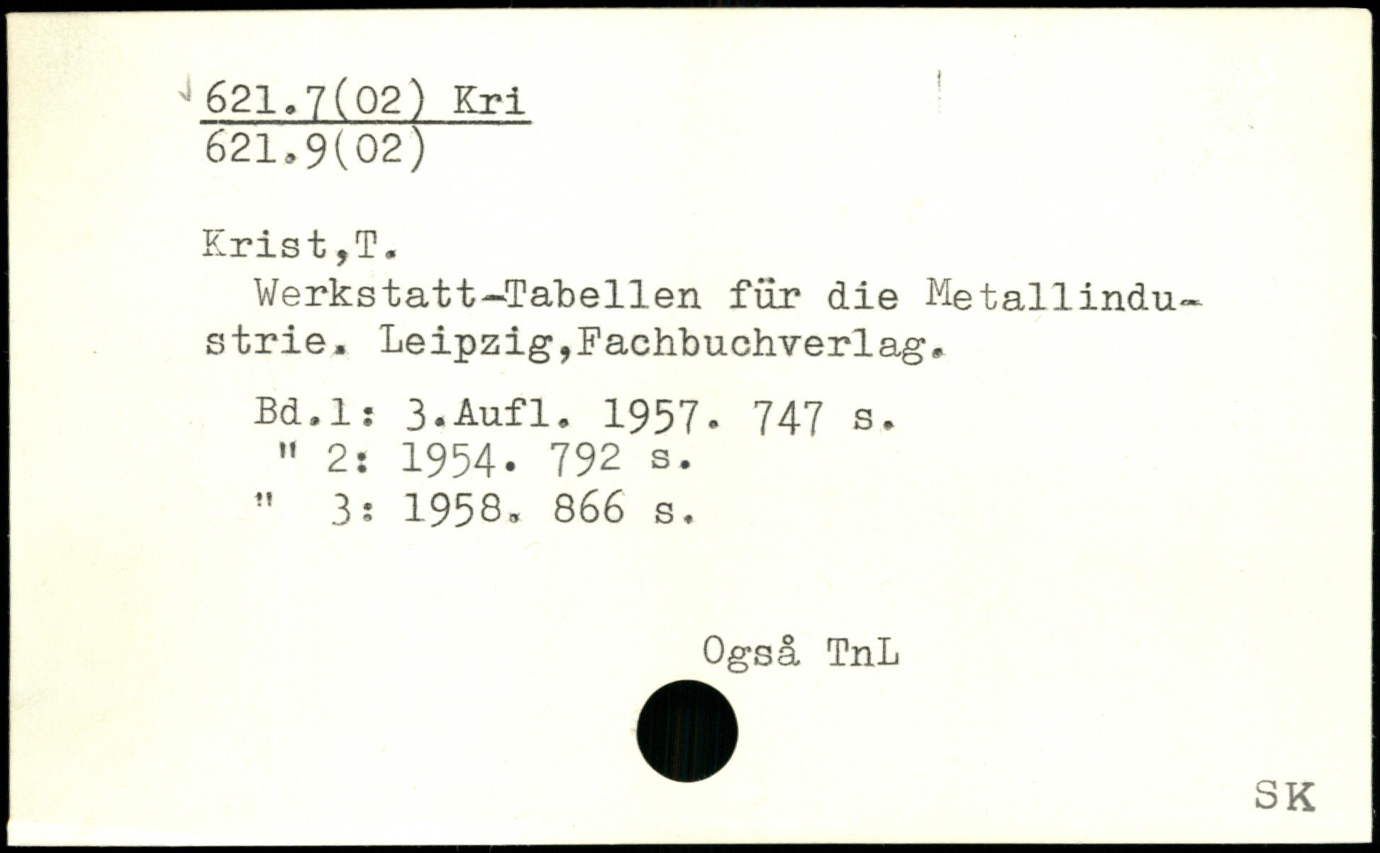 Werkstatt—Tabellen für die Metallindustrie. Leipzig,Fachbuchverlag, Bd.l: