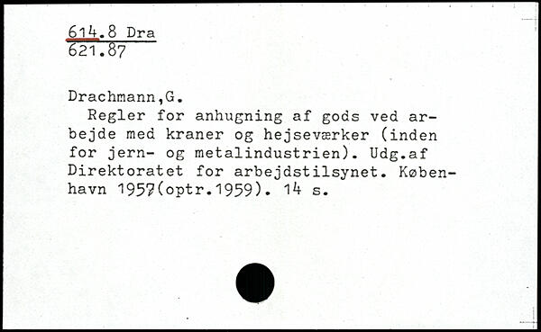 Regler for anhugning af gods ved arbejde med kraner og hejseværker (inden for jern- og metalindustrien). Udg.af Direktoratet for arbejdstilsynet. København l95?(optr.1959). s.