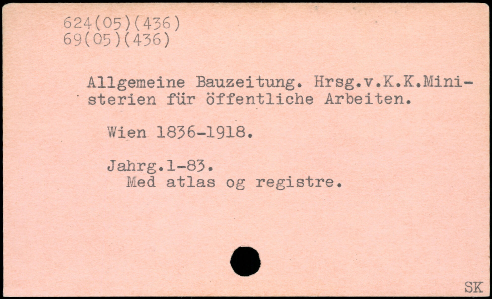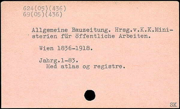 Allgemeine Bauzeitung. Hrsg.v.K.K.Mini-' sterien für öffentliche Arbeiten. V/ien 1836-1918. Jahrg.1-83. Med atlas og registre.