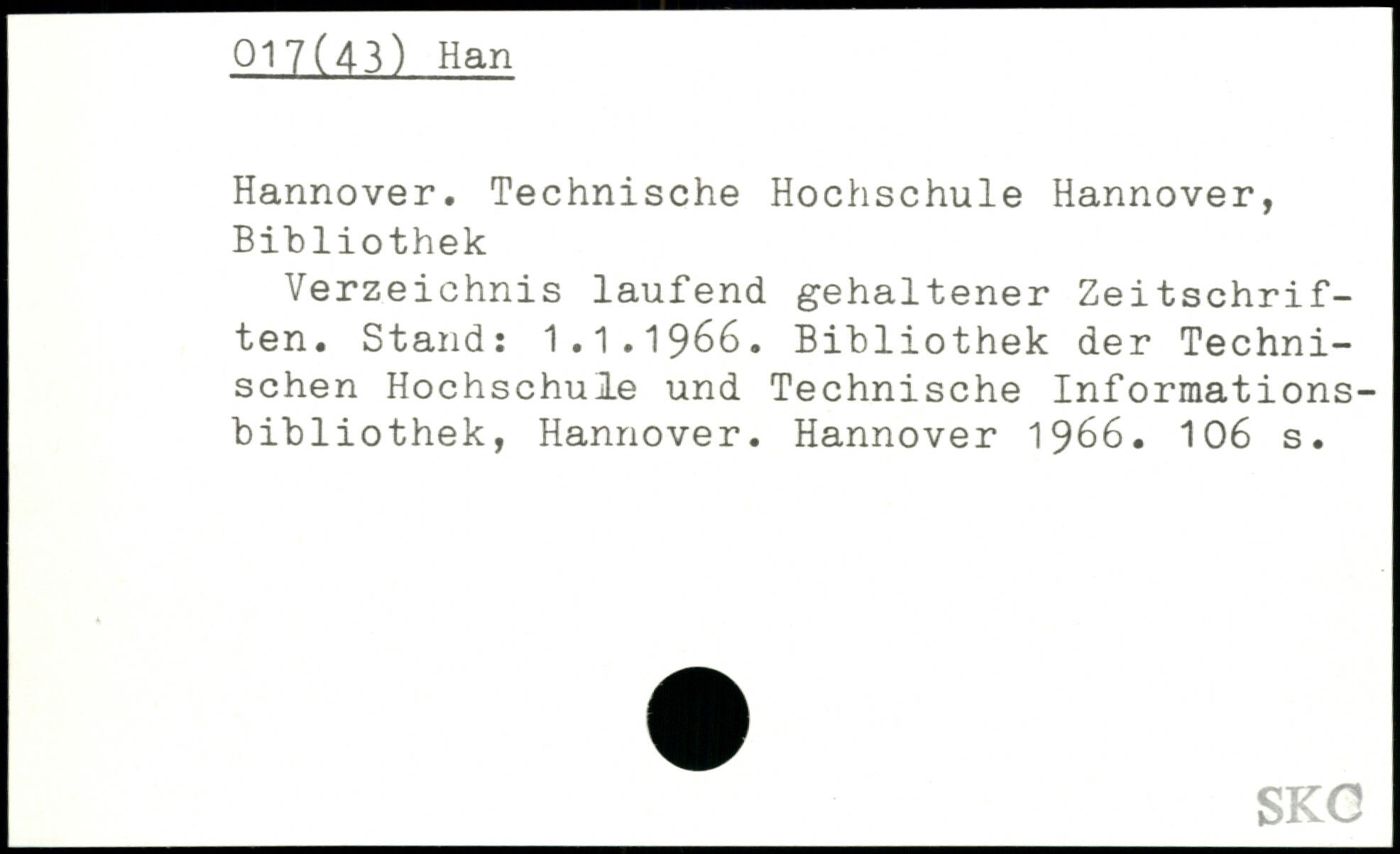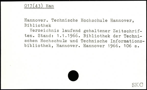 Hannover. Technische Hochschule Hannover, Bibliothek Verzeichnis laufend gehaltener Zeitschriften. Stand: 1.1.1966. Bibliothek der Technischen Hochschule und Technische Informationsbibliothek, Hannover.