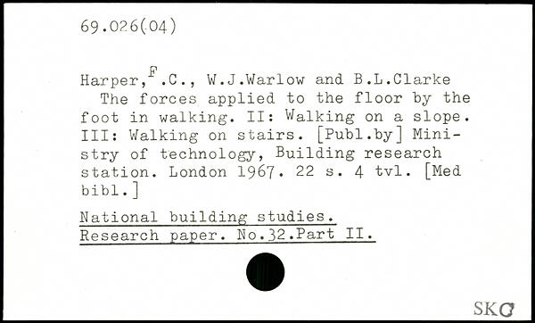 Harper, .C., W.J.Warlow and B.L.Clarke The forces applied to the floor by the foot in walking. II: Walking on a slope. Ill: Walking on stairs.