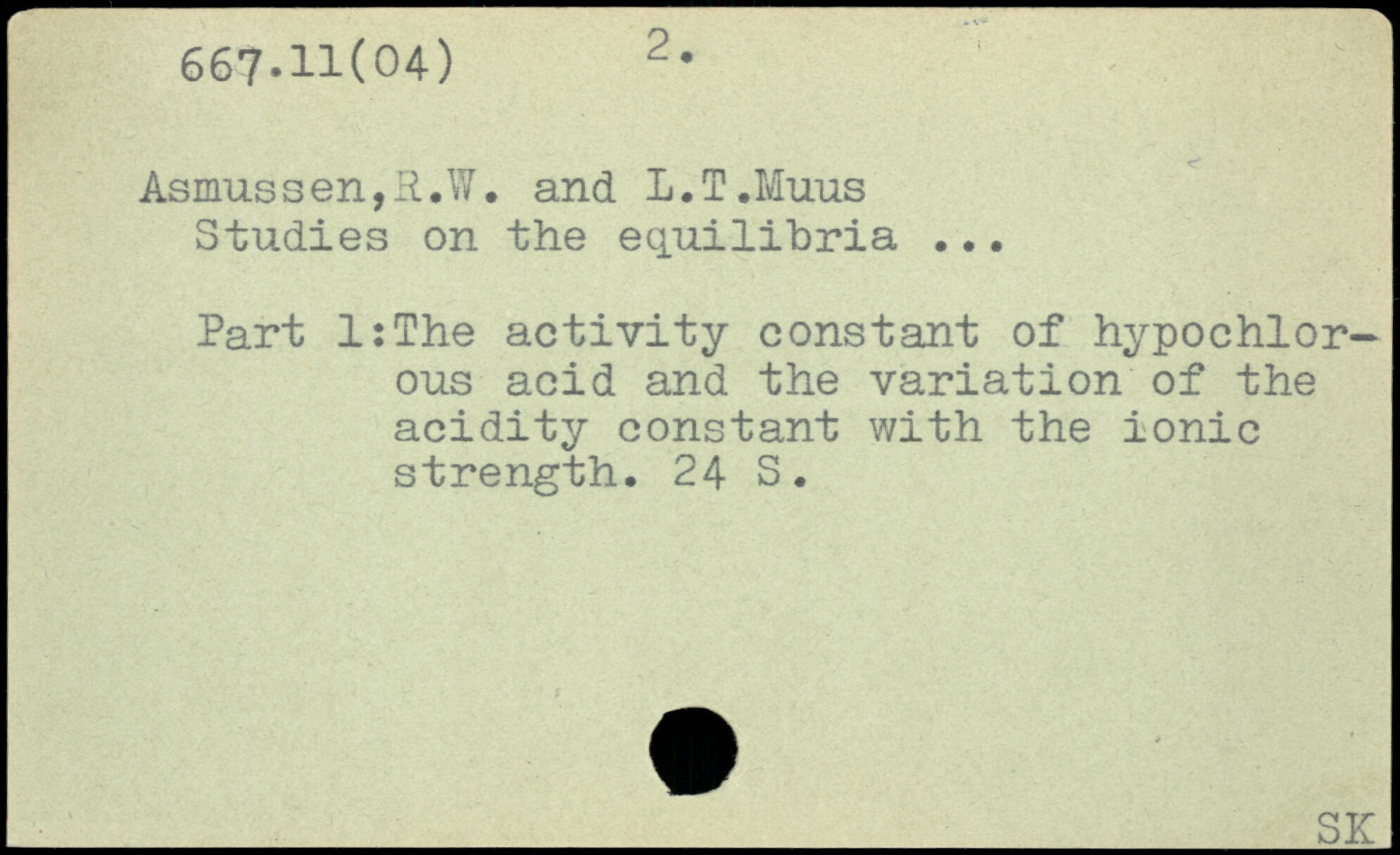 Asmussen,R.W. and l.T.Muus Studies on the equilibria ... Part l:The activity constant of hypochlor-ous acid and the variation of the acidity constant with the ionic strength.