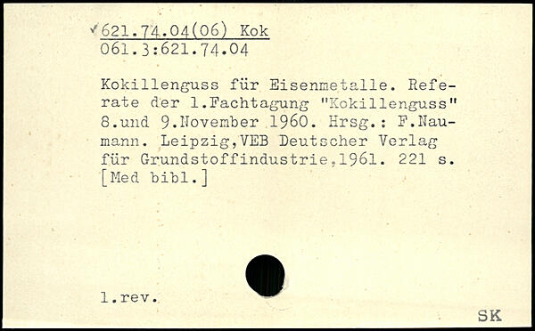Kokillenguss für Eisenmetalle. Referate der 1.Fachtagung "Kokillenguss" 8.und 9.November 1960. Hrsg.: F.Naumann. Leipzig,VEB Deutscher Verlag für GrundstoffIndustrie.1961.