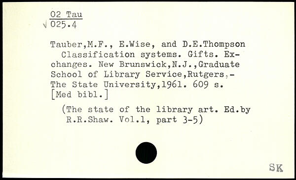 Tauber,M.F., E.Wise, and D.E.Thompson Classification systems. Gifts. Exchanges. New Brunswick,N.J.,Graduate School of Library Service,Rutgers,-The State University,1961.