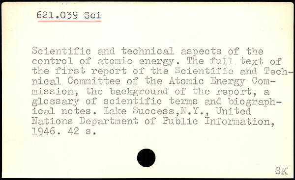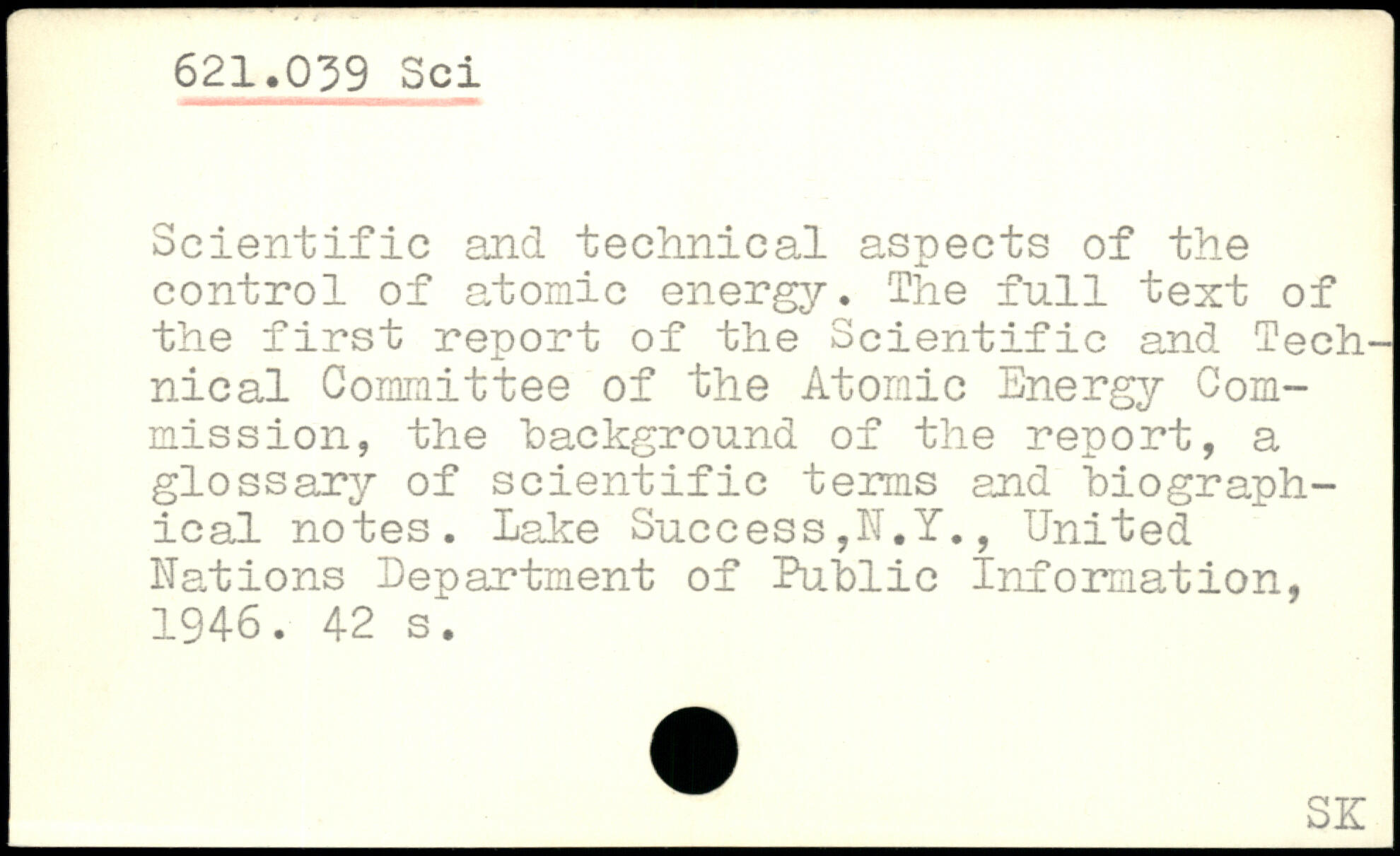 Scientific and technical aspects of the control of atomic energy. The full text of the first report of the Scientific and Technical Committee of the Atomic Energy Commission, the background of the report, a glossary of scientific terms and biographical notes, lake Success,N.Y., United Nations Department of Public Information, 1946.