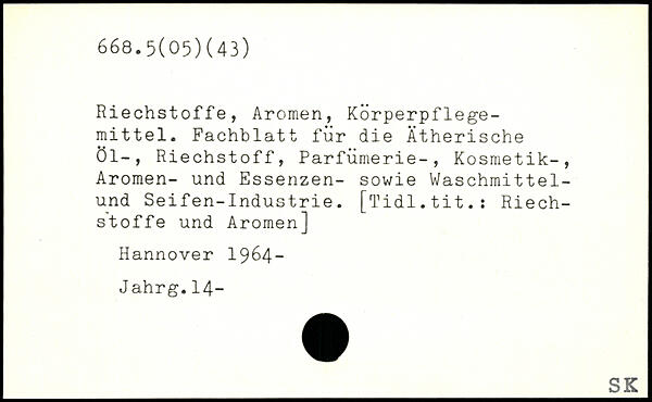 Riechstoffe, Aromen, Körperpflegemittel. Fachblatt für die Ätherische Öl-, Riechstoff, Parfümerie-, Kosmetik-, Aromen- und Essenzen- sowie Waschmittelund Seifen-Industrie. [Tidl.tit.: Riechstoffe und Aromen]