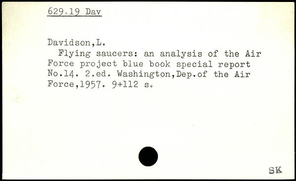 Plying saucers: an analysis of the Air Force project blue book special report No.14. 2,ed. Washington,Dep.of the Air Force,1957. 9+U
