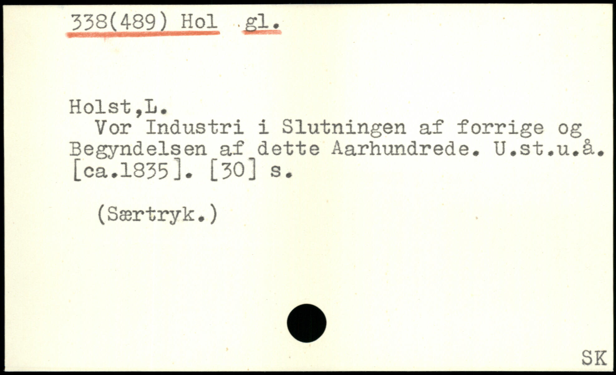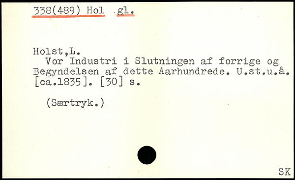 Vor Industri i Slutningen af forrige og Begyndelsen af dette Aarhundrede. U.st.u.å. [ca.1835]. [30] s.