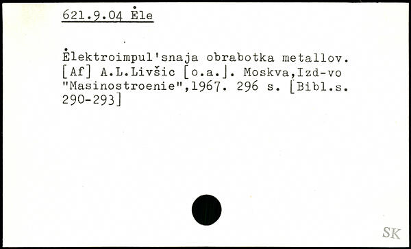 Elektroimpul1snaja obrabotka metallov. [Af] A.L.Livsic [o.a.J. Moskva,Izd-vo "Masinostroenie",1967.