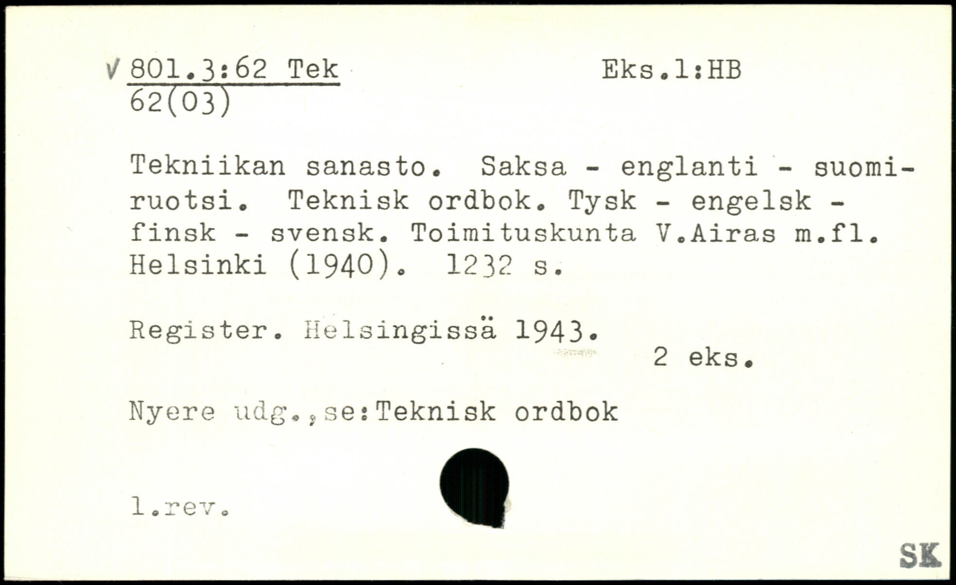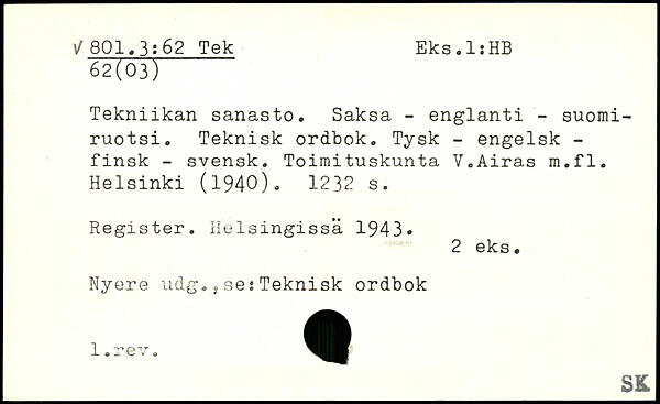 Tekniikan sanasto. Saksa - englanti - suomi-ruotsi. Teknisk ordbok. Tysk - engelsk -finsk - svensk. Toiraituskunta V.Airas m.fl. Helsinki (1940).