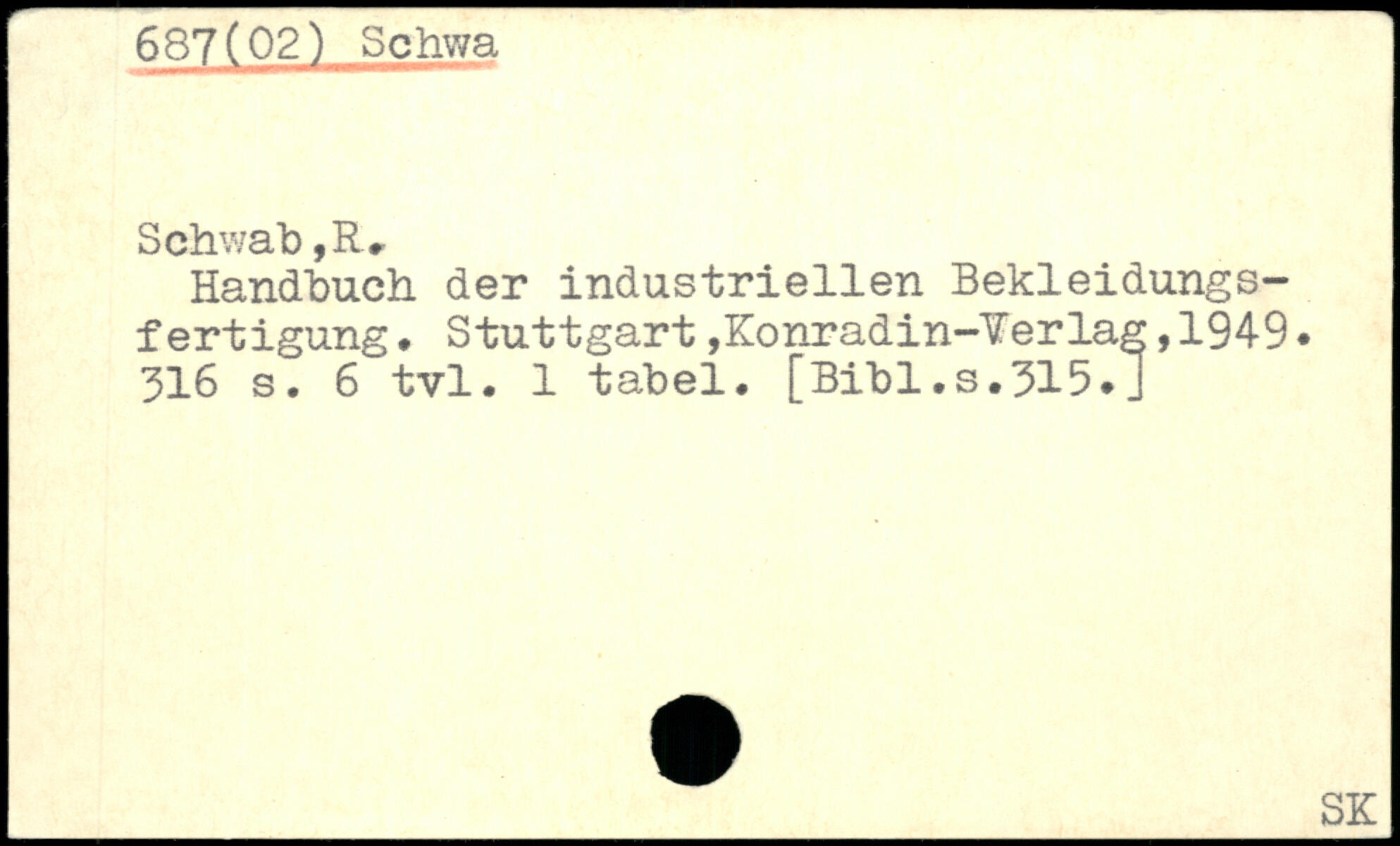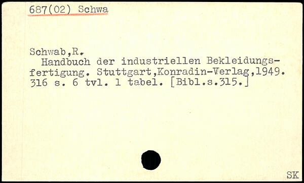 Schws Schwab,R. Handbuch der industriellen Bekleidungsfertigung. Stuttgart,Konradin-¥erlag,1949.