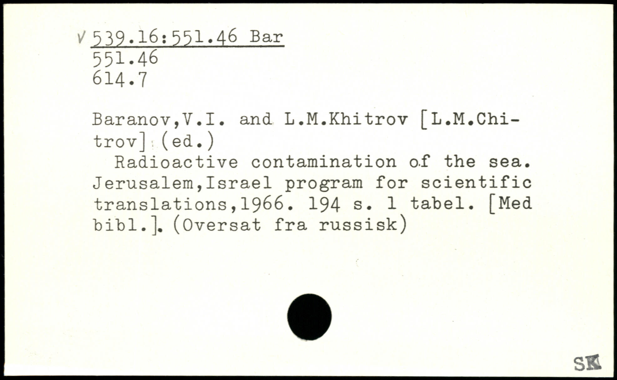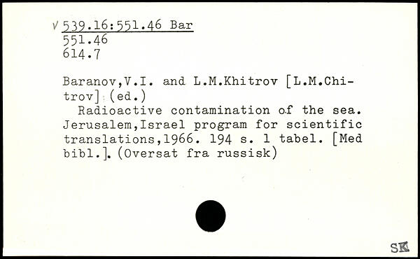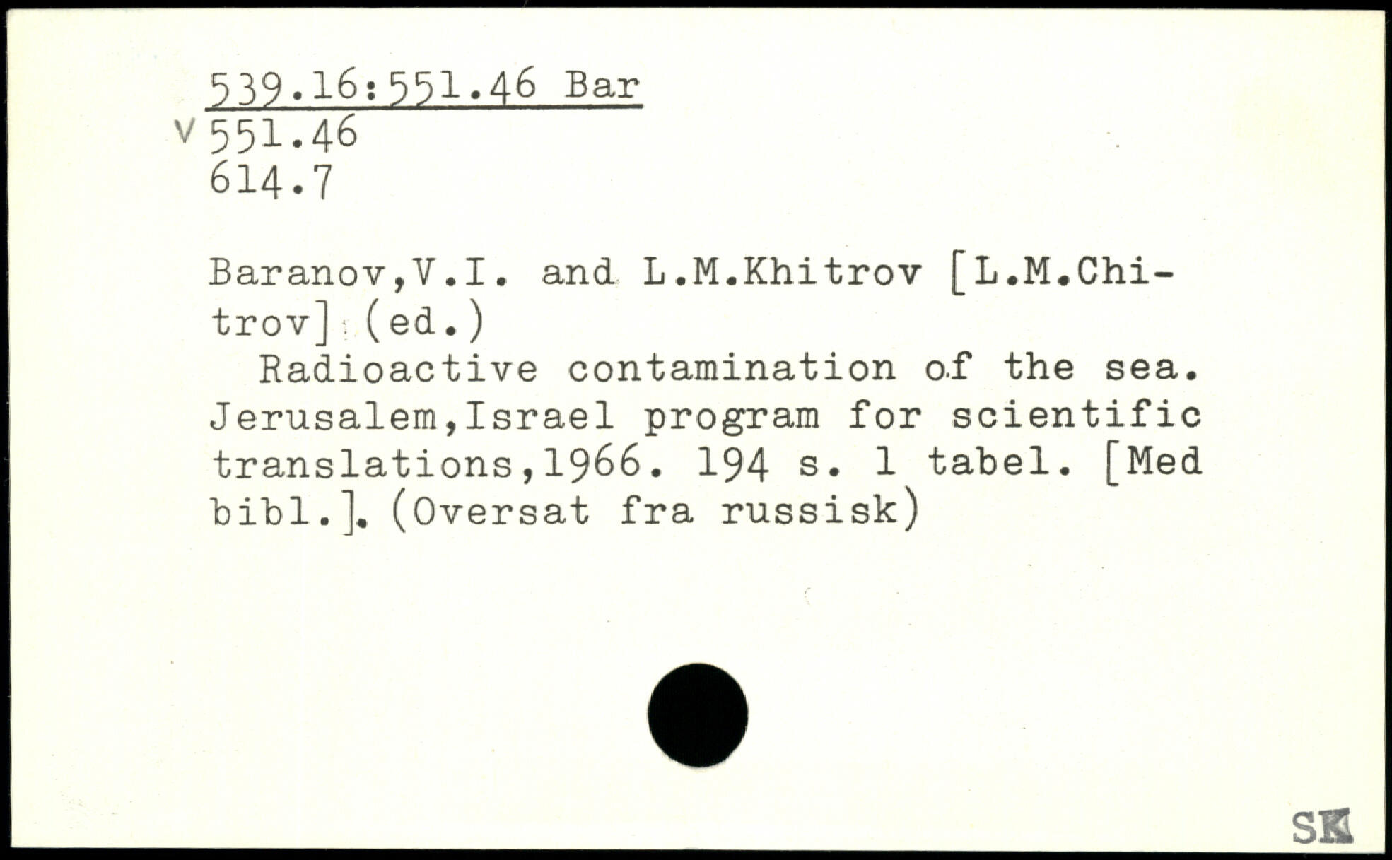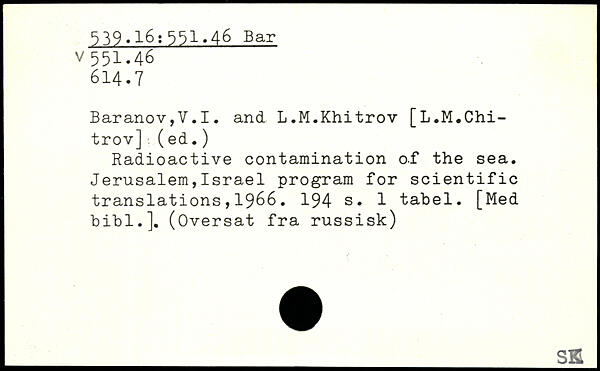 Baranov,V.I. and L.M.Khitrov [L.M.Chi-trov] (ed.) Radioactive contamination o.f the sea. Jerusalem,Israel program for scientific translations,1966.