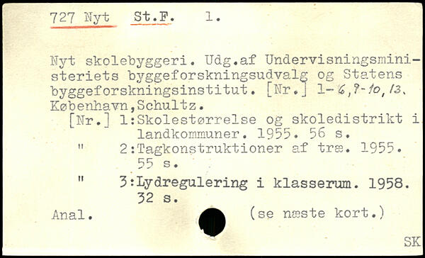 Nyt skolebyggeri. Udg.af Undervisningsministeriets byggeforskningsudvalg og Statens byggeforskningsinstitut. [Nr.j 1 København,Schultz. [Nr.] 1:Skolestørrelse og skoledistrikt i landkommuner. 1955.
