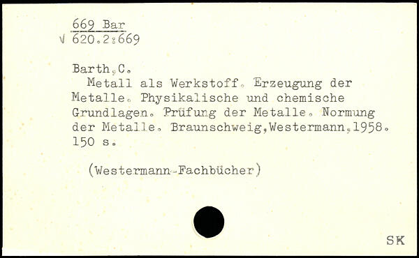 Metall als Werkstoff, Erzeugung der Metaller, Physikalische und chemische Grundlagen, Prüfung der Metalle, Normung der Metalle, Braunschweig,Westermann,1958. 150 S s