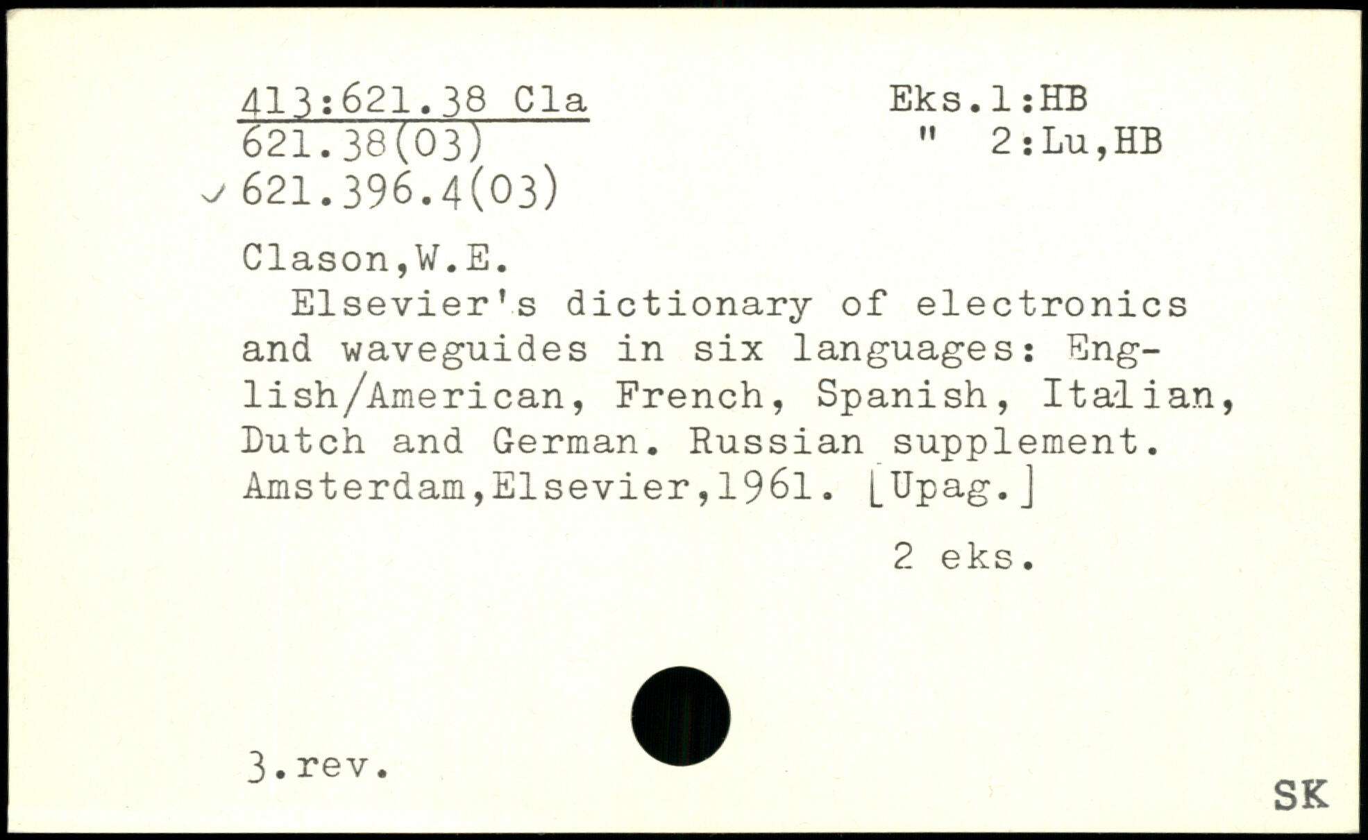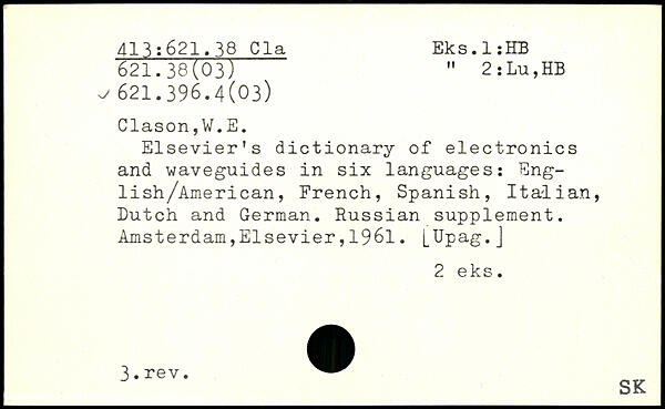 Elsevier's dictionary of electronics and -waveguides in six languages: Eng-lish/American, French, Spanish, Italian, Dutch and German. Russian supplement.