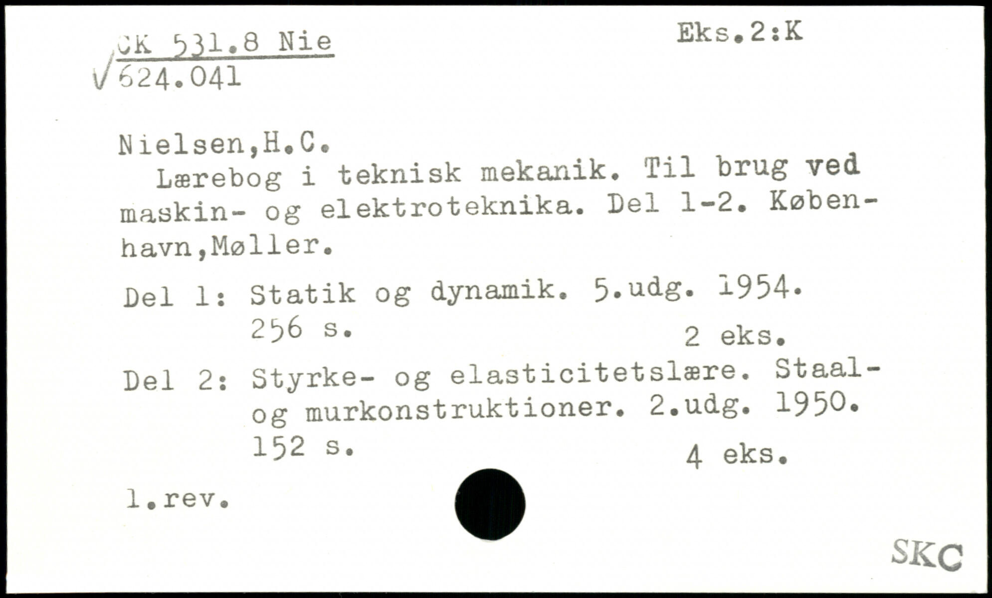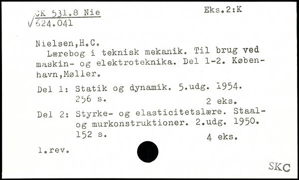 Lærebog i teknisk mekanik, Til brug ved. maskin- og elektroteknika. Del 1-2, København ,Møller. Del 1: Statik og dynamik. 5-udg. 1954.