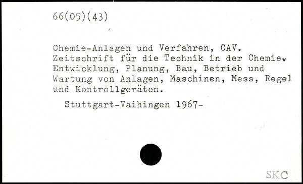 Chemie-Anlagen und Verfahren, CAV. Zeitschrift für die Technik in der Chemie,-Entwicklung, Planung, Bau, Betrieb und Wartung von Anlagen, Maschinen, Mess, Rege] und Kontrollgeräten. Stuttgart-Vaihingen 1967-