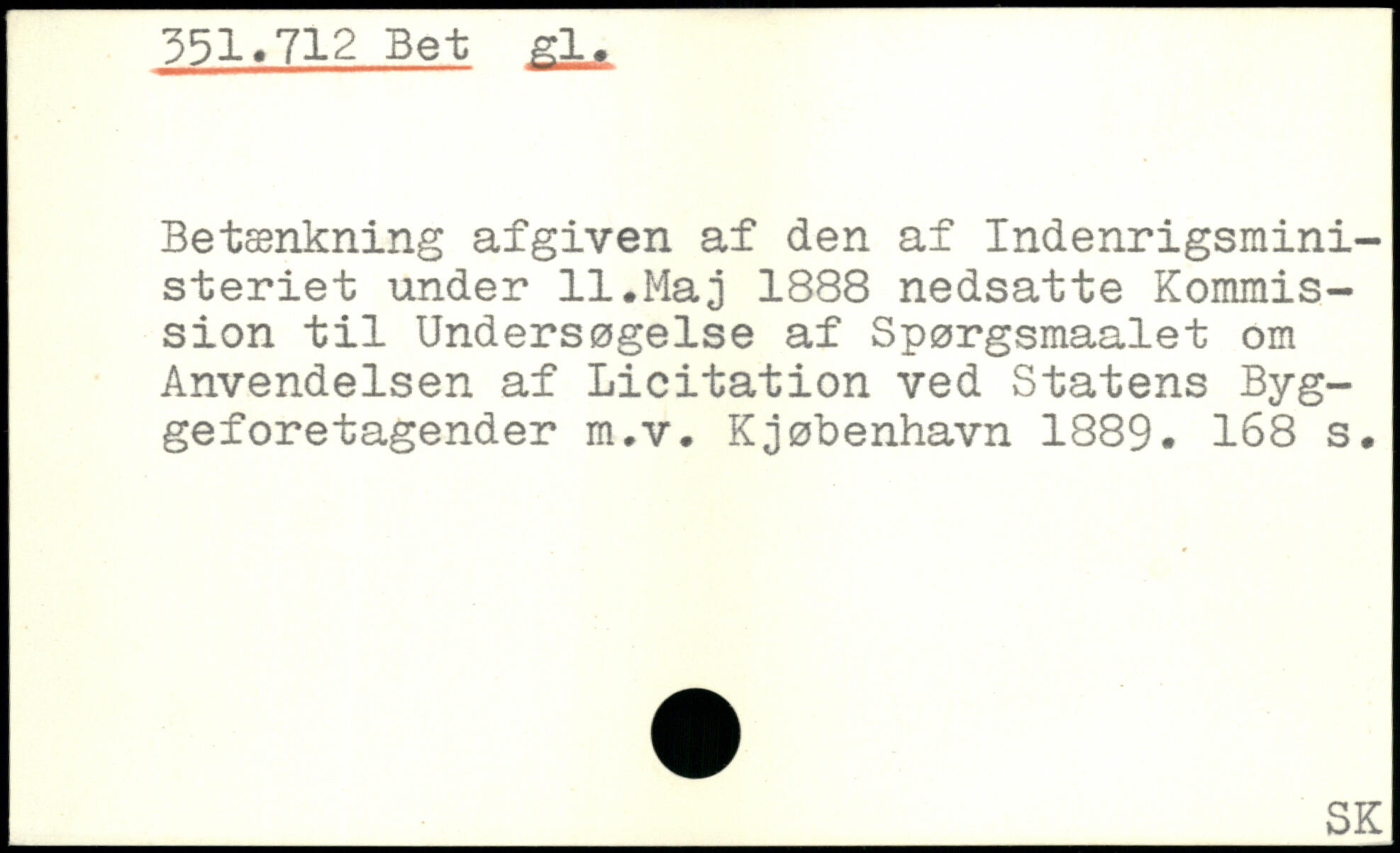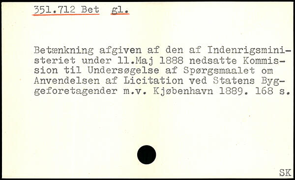 Betænkning afgiven af den af Indenrigsministeriet under 11.Maj 1888 nedsatte Kommission til Undersøgelse af Spørgsmaalet om Anvendelsen af Licitation ved Statens Byggeforetagender m.v. Kjøbenhavn 1889.