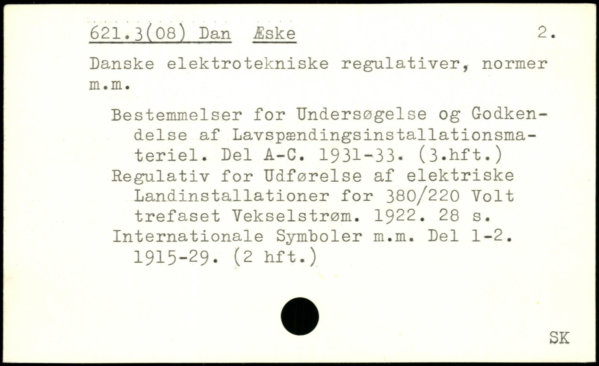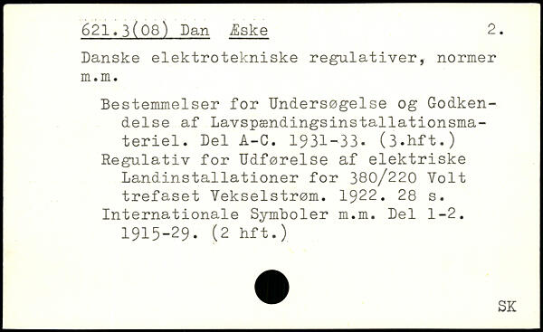Danske elektrotekniske regulativer, normer m.m. Bestemmelser for Undersøgelse og Godkendelse af Lavspændingsinstallationsmateriel. Del A-G. 1931-33. (3.hft.) Regulativ for Udførelse af elektriske Landinstallationer for 380/220 Volt trefaset Vekselstrøm. 1922.