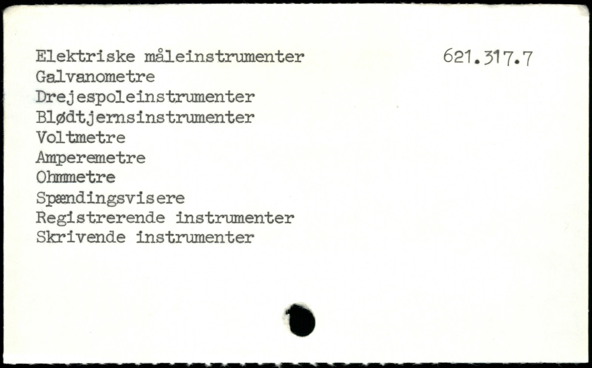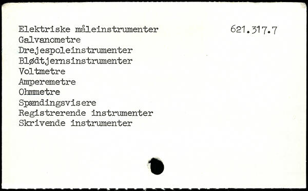 Elektriske måleinstrumenter 621.317, 7 Galvanomètre Drej espoleinstrumenter Blødt j ems instrumenter Voltmetre Amperemetre Ohmmetre Spændingsvis ere Registrerende instrumenter Skrivende instrumenter