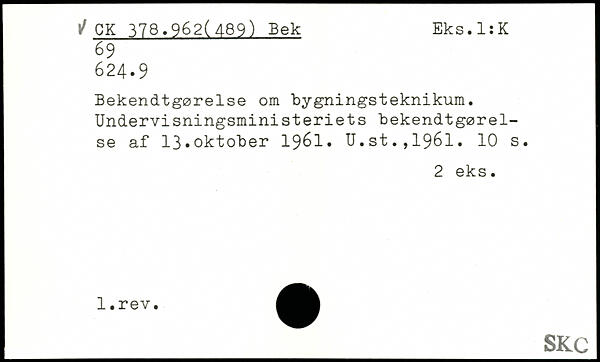 Bekendtgørelse om bygningsteknikum. Undervisningsministeriets bekendtgørelse af 13.oktober 1961. U.st.,1961.