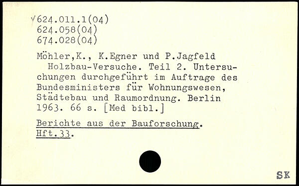 Möhler,K., K.Egner und P.Jagfeld Holzbau-Versuche. Teil 2. Untersuchungen durchgefuhrt im Aufträge des Bundesministers für Wohnungswesen, Städtebau und Raumordnung.