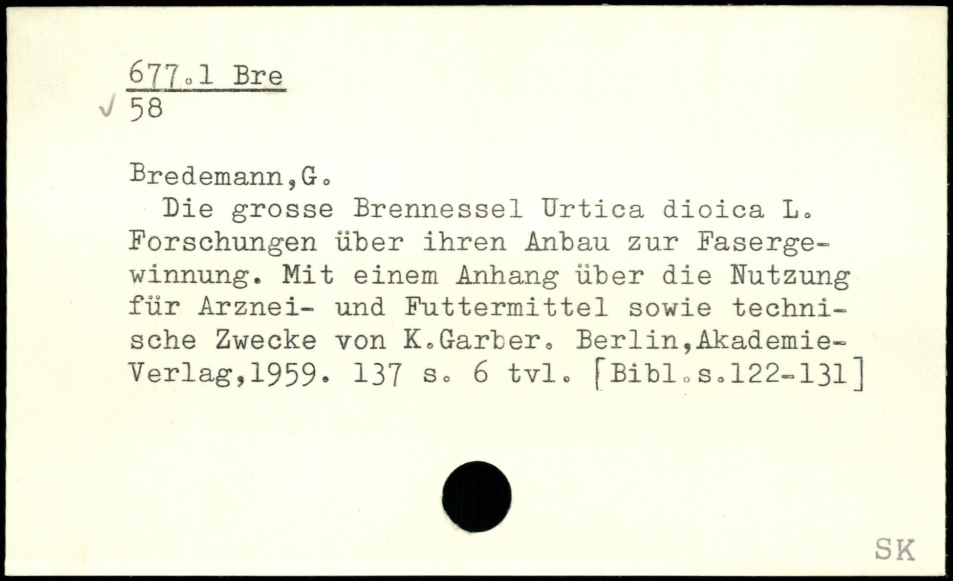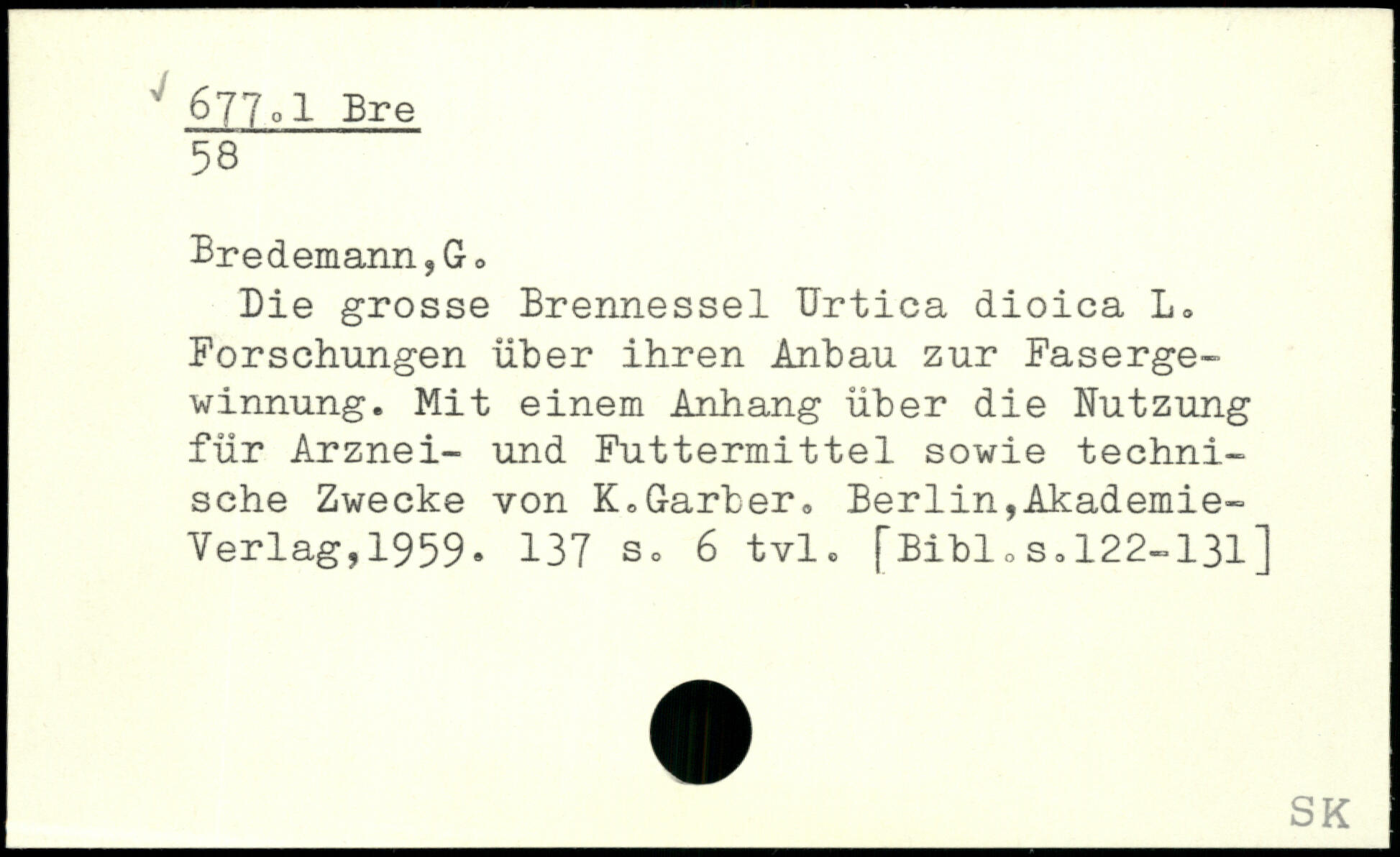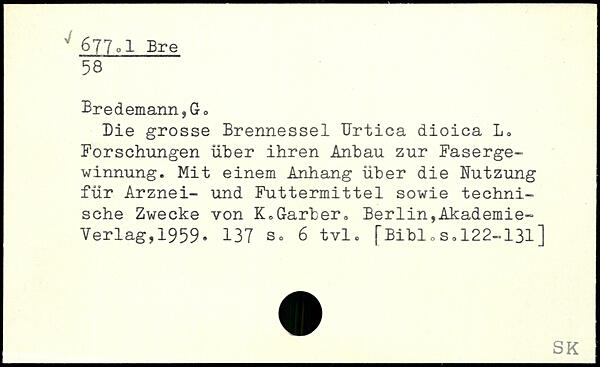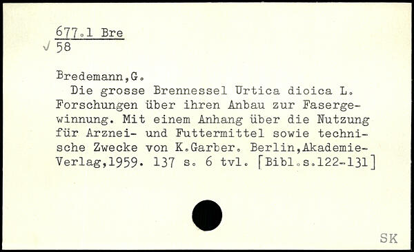 Die grosse Brennessel Urtica dioica L. Forschungen über ihren Anbau zur Fasergewinnung. Mit einem Anhang über die Nutzung für Arznei- und Futtermittel sowie technische Zwecke von K.