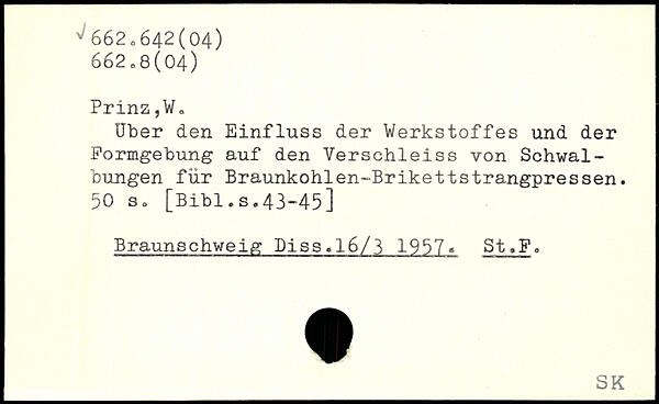 Prinz,Wa Uber den Einfluss der Werkstoffes und der Formgebung auf den Verschleiss von Schwalbungen für Braunkohlen-Brikettstrangpressen.