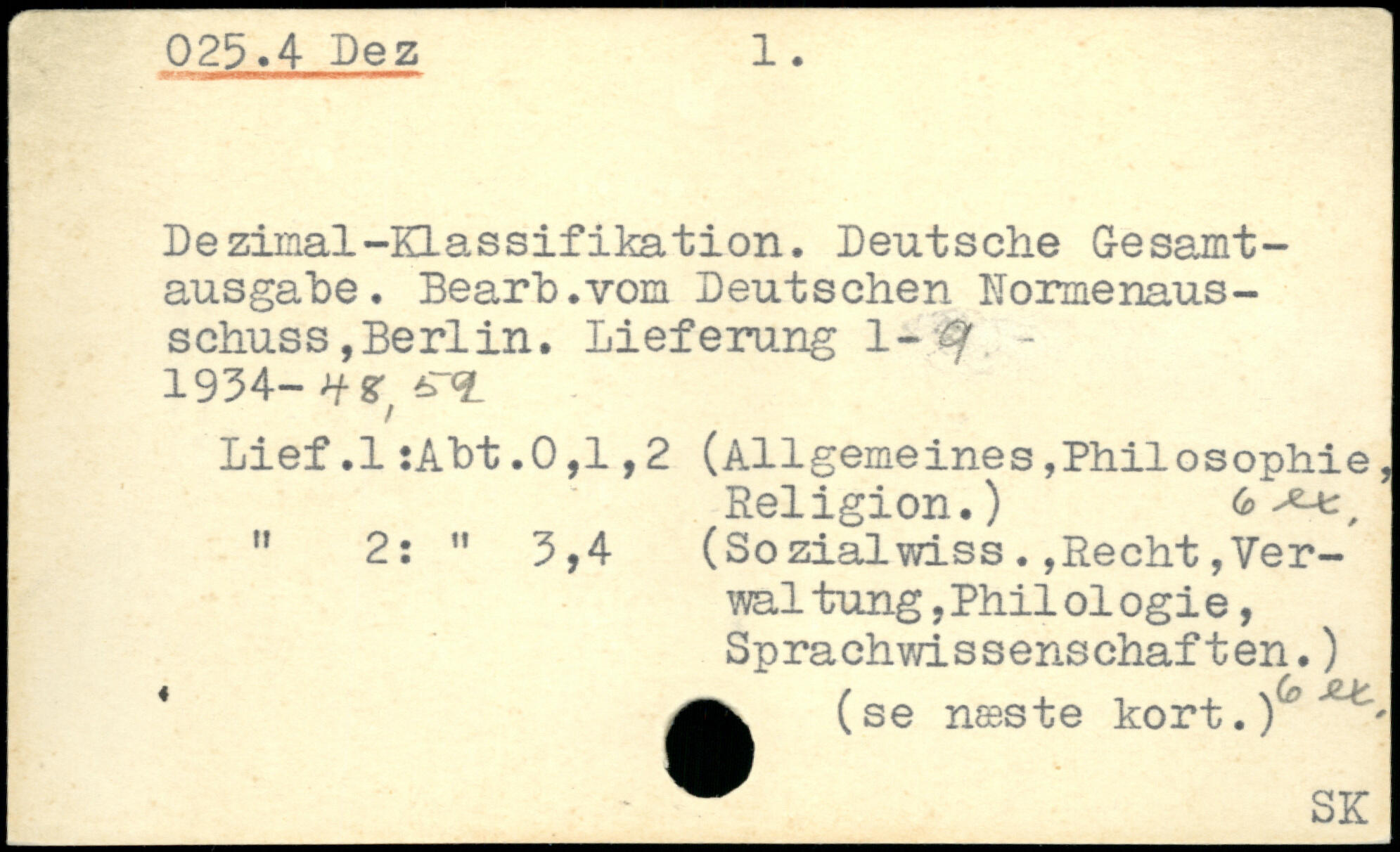 Dezimal-Klassifikation. Deutsche Gesamt-ausgahe. Bearb.vom Deutschen llormenaus-schuss,Berlin. Lieferung 1-^ -1934- Lief.1:Abt .0,1,2 (Allgemeines,PhiloSophie, Religion.) 6 ” 2: " 3,4 (Sozialwiss.,Recht,Ver- waltung,Philologi e, Sprachwissenschaften.) (se næste kort.)05