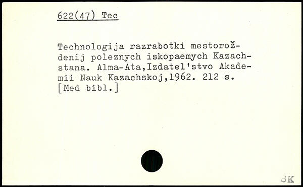 Technologija razrabotki mestoroz-denij poleznych iskopaemych Kazach-stana. Alma-Ata,Izdatel’stvo Akademi! Nauk Kazachskoj,1962.