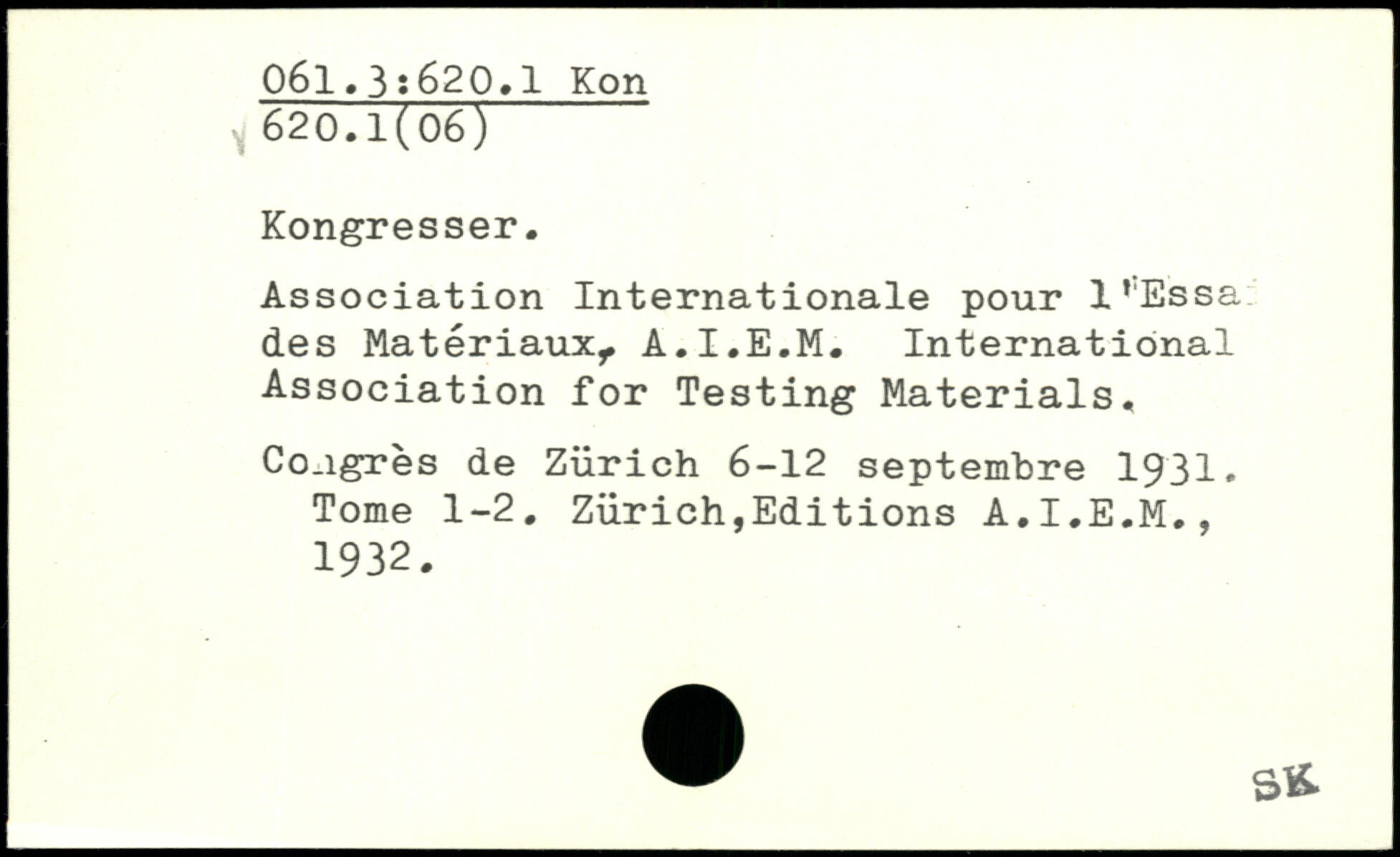 Association Internationale pour l’Essa des Matériaux,. A.I.E.M. International Association for Testing Materials, Co.igrès de Zürich 6-