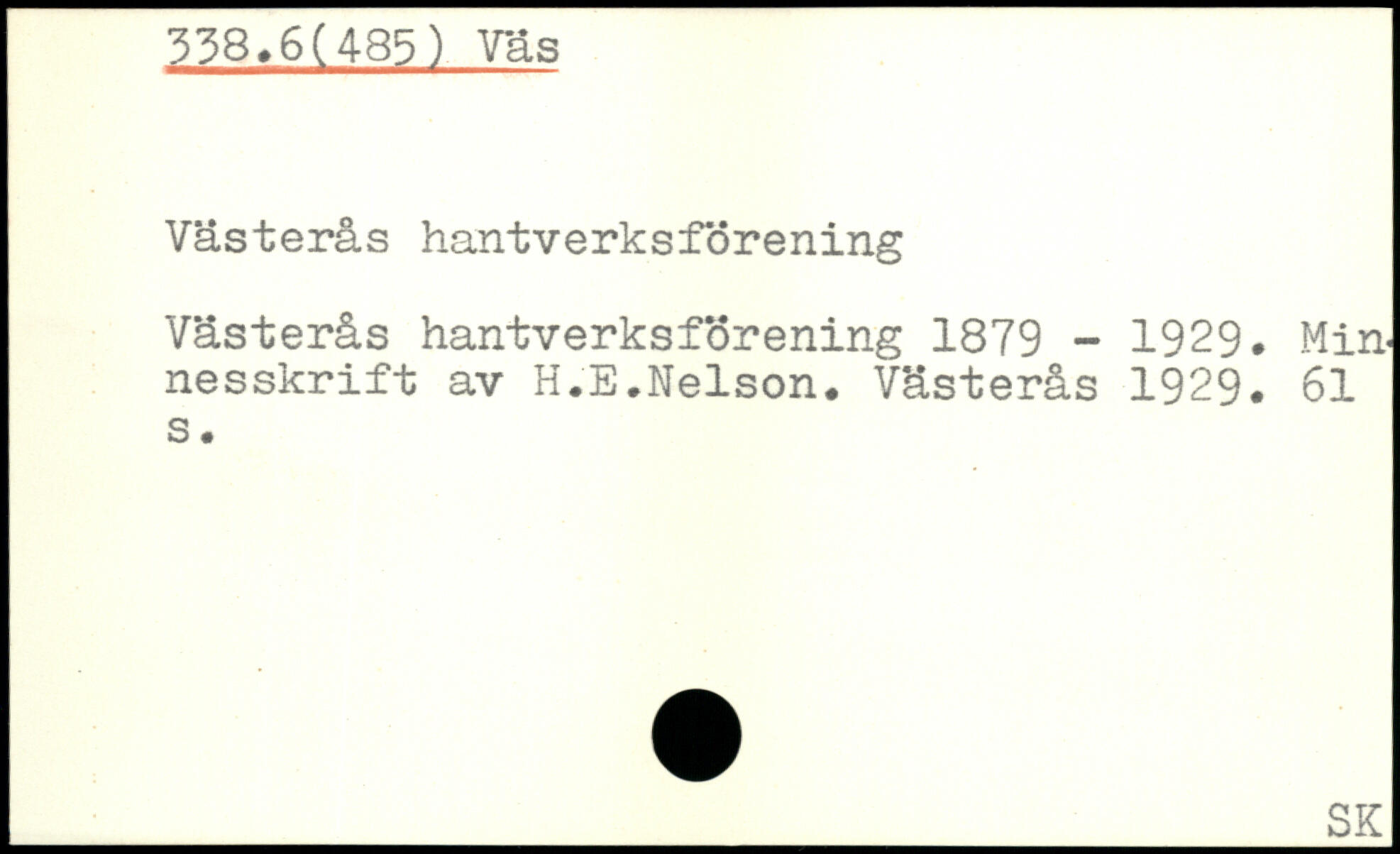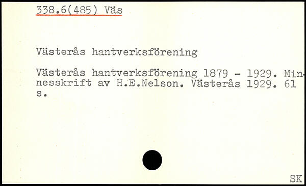 Västerås hantverksförening Västerås hantverksförening 1879 - 1929. Minnesskrift av H.E.Nelson. Västerås 1929.