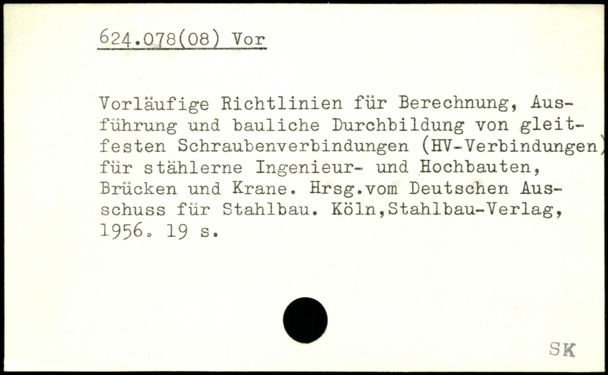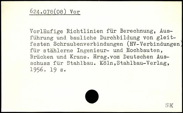 Vorläufige Richtlinien für Berechnung, Ausführung und bauliche Durchbildung von gleitfesten Schraubenverbindungen (HV-Verbindungen, für stählerne Ingenieur- und Hochbauten, Brücken und Krane. Hrsg.vom Deutschen Ausschuss für Stahlbau. Köln,Stahlbau-Verlag, I.9560