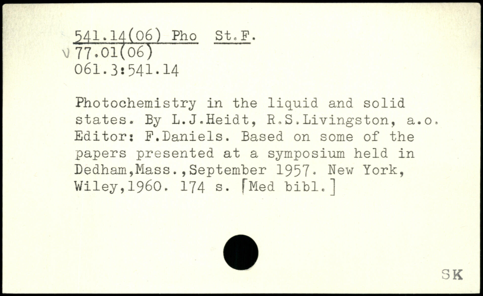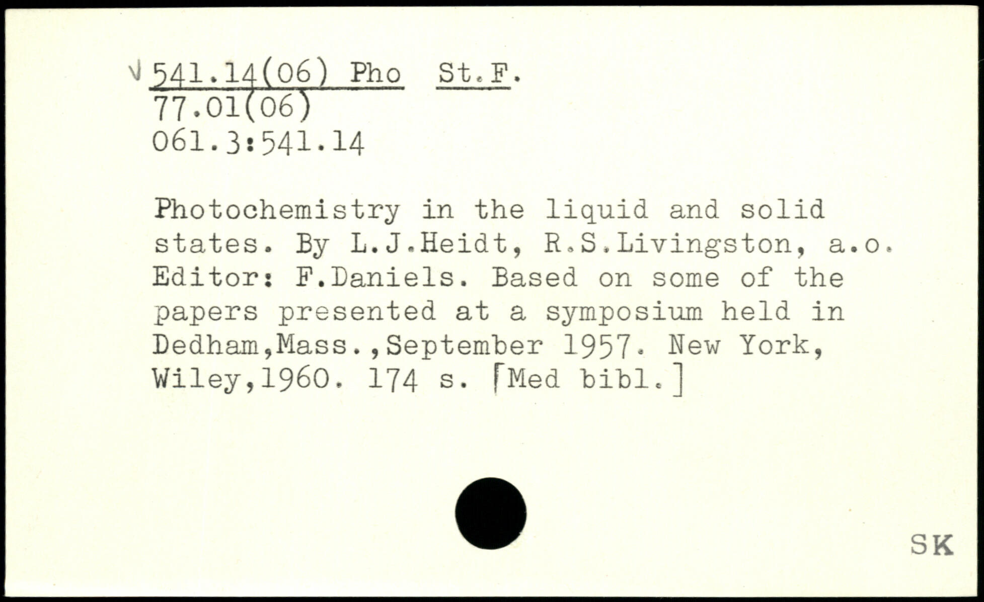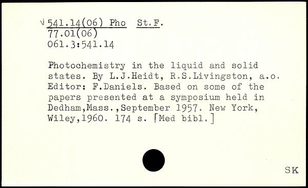 Photochemistry in the liquid and solid states. By L.J.Heidt, R.S.Livingston, a.o. Editor: F.Daniels. Based on some of the papers presented at a symposium held in Dedham,Mass.,September 1957.