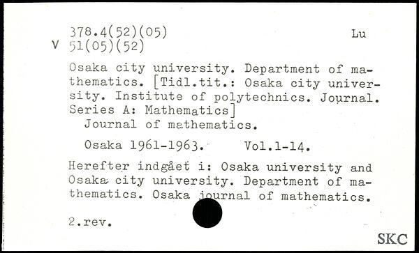 Osaka city university. Department of mathematics. [Tidl.tit.: Osaka city university. Institute of polytechnics. Journal. Series A: Mathematics] Journal of mathematics. Osaka 1961-1963. V0I.I-I4. Herefter indgået i: Osaka university and Osaka, city university. Department of mathematics. Osaka ^urnal of mathematics.