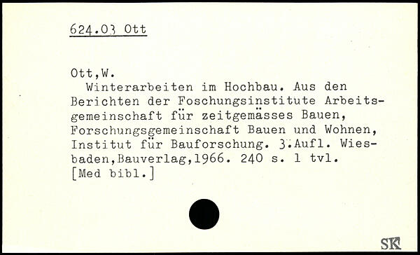 ott,w. Winterarbeiten im Hochbau. Aus den Berichten der Foschungsinstitute Arbeitsgemeinschaft für zeitgemässes Bauen, Forschungsgemeinschaft Bauen und Wohnen, Institut für Bauforschung.