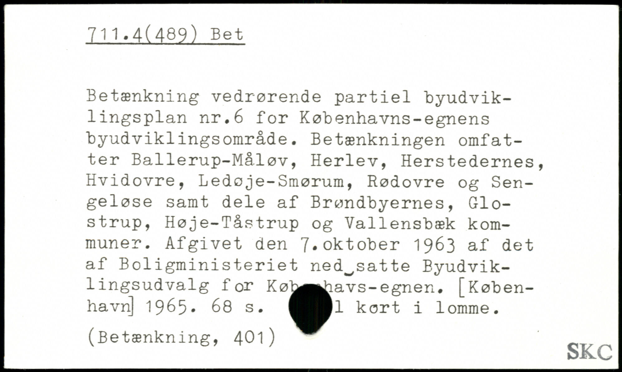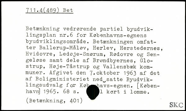 Betænkning vedrørende partiel byudviklingsplan nr.6 for Københavns-egnens byudviklingsområde. Betænkningen omfatter Ballerup-Måløv, Herlev, Herstedernes, Hvidovre, Ledoje-Smørum, Rødovre og Sengeløse samt dele af Brøndbyernes, Glostrup, Høje-Tåstrup og Vallensbæk kommuner. Afgivet den 7.oktober 1963 af det af Boligministeriet ned^satte Byudvik- i lingsudvalg for Køj^^iavs-egnen.