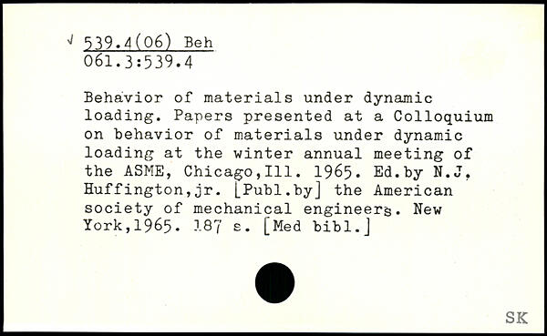 Behavior of materials under dynamic loading. Papers presented at a Colloquium on behavior of materials under dynamic loading at the winter annual meeting of the ASME, Chicago,111. 1965. Ed.by N.J, Huffington,jr.