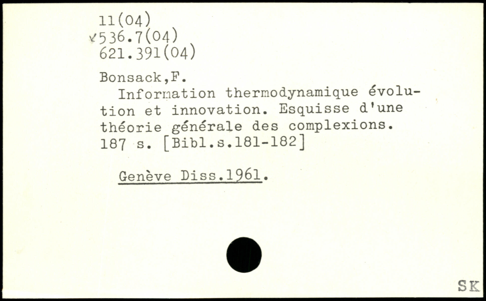 Information thermodynamique evolution et innovation. Esquisse d'une théorie générale des complexions.